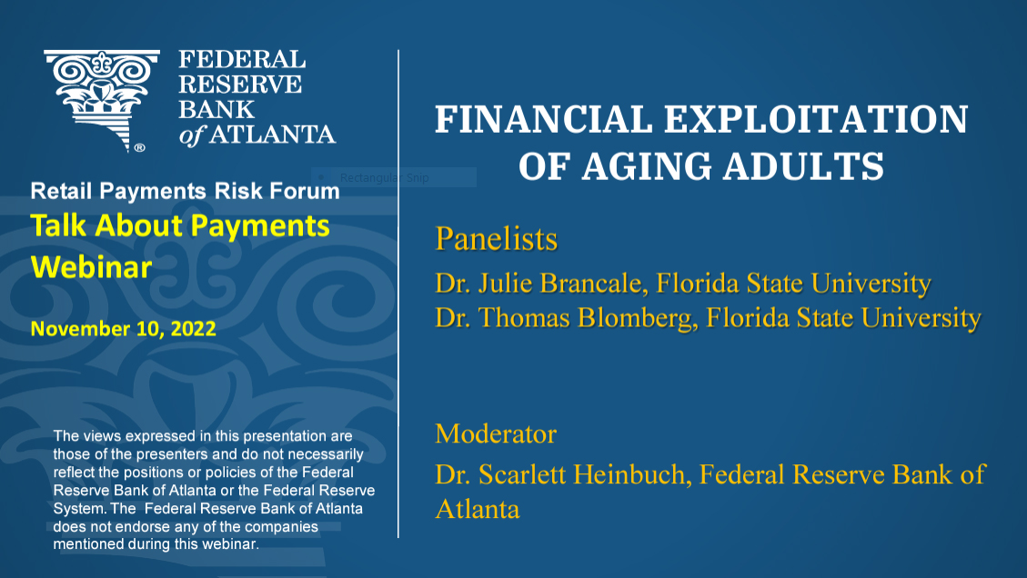 The Co-Directors of the Aging Adult Fraud Research & Policy Institute, Dr. Thomas G. Blomberg and Dr. Julie Brancale recently appeared on the Federal Reserve Bank of Atlanta's Talk About Payments Webinar to discuss financial exploitation of aging adults.
