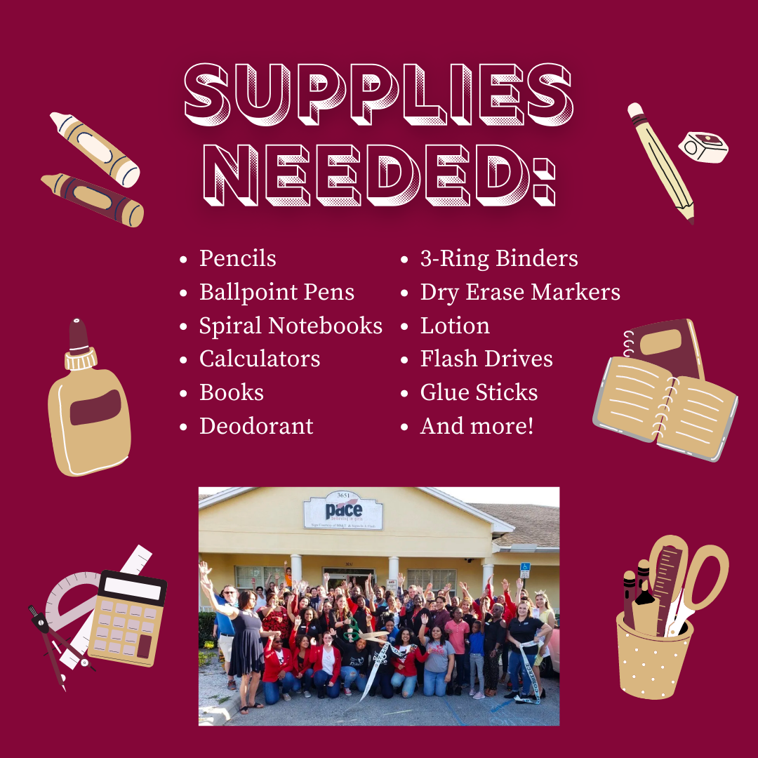SLC will accept donations for our School Supply Drive to benefit the PACE Center for Girls at each event this semester!