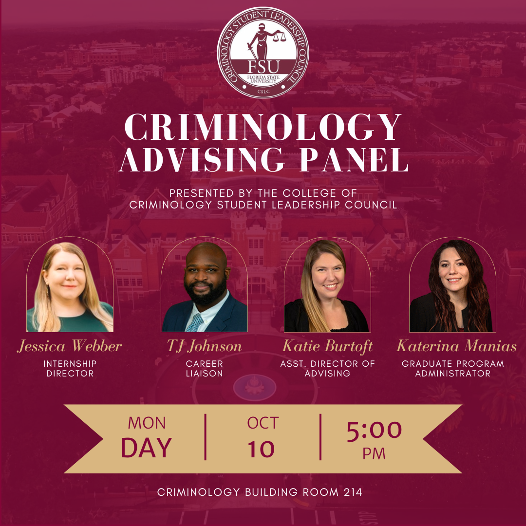 The College of Criminology and Criminal Justice Student Leadership Council (SLC) invites you to a Criminology Advising Panel event on Monday, October 10th, at 5:00 pm. Join us, connect with the Student Leadership Council, and get your college and career questions answered by a panel of Criminology Advisors!