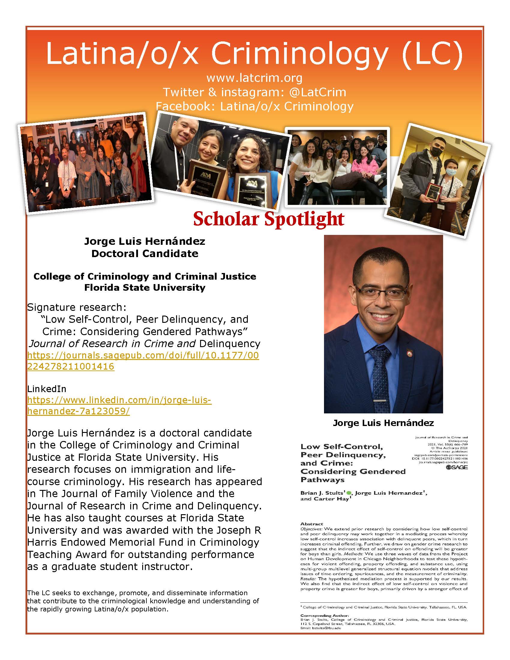 The College of Criminology and Criminal Justice applauds Jorge Hernández on being recognized by Latina/o/x Criminology (LC) as their featured Latina/o/x scholar for April 2022. Jorge's research focuses on immigration and life-course criminology and his research has appeared in the Journal of Family Violence and the Journal of Research in Crime and Delinquency. He has also taught courses at Florida State University and was awarded with the Joseph R Harris Endowed Memorial Fund in Criminology Teaching Award for outstanding performance as a graduate student instructor.